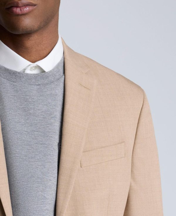 - Jacket: notched lapel, higher armhole placement with stretch, single-breasted with matching shell-look buttons, double vented, side flap pockets