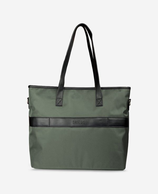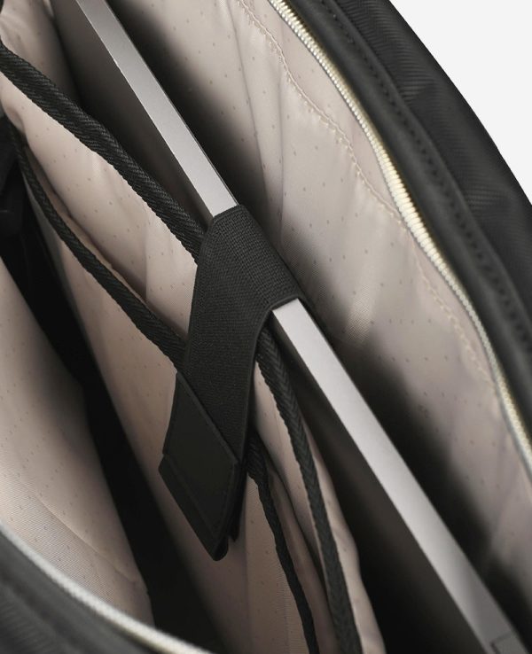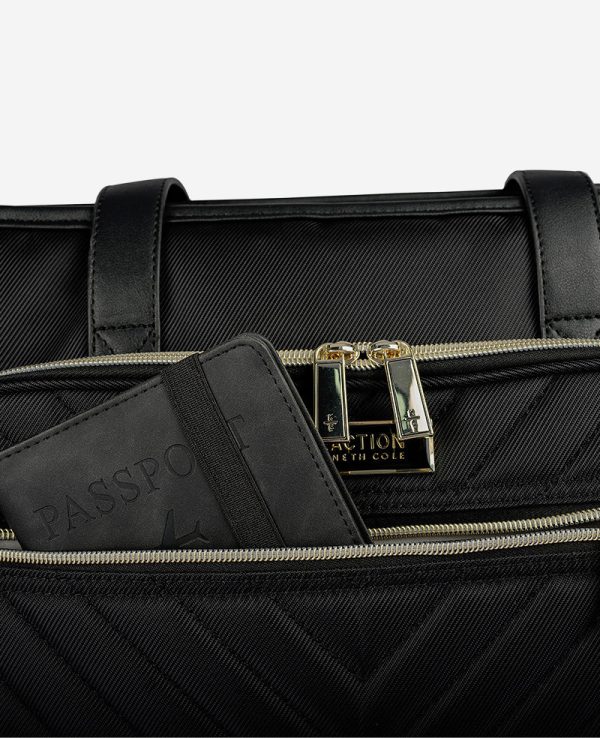 - The tote’s rear features a trolley strap that fits over most luggage upright handles for hands-free carrying